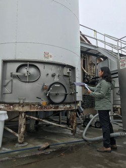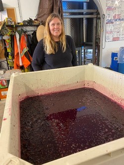 | Doris Michue monitoring fermentation vessels | Marti Quan with fermenting red wine grape juice |